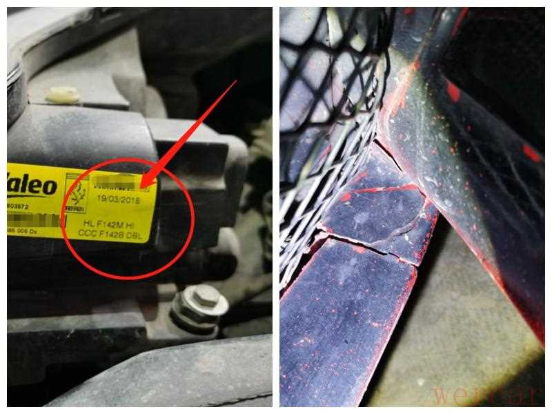 检查前部部件,发现右前大灯出厂日期为2018年3月,是后期更换的,前保险杠等部件缝隙比较大,为后期更换,还有明显破损情况。