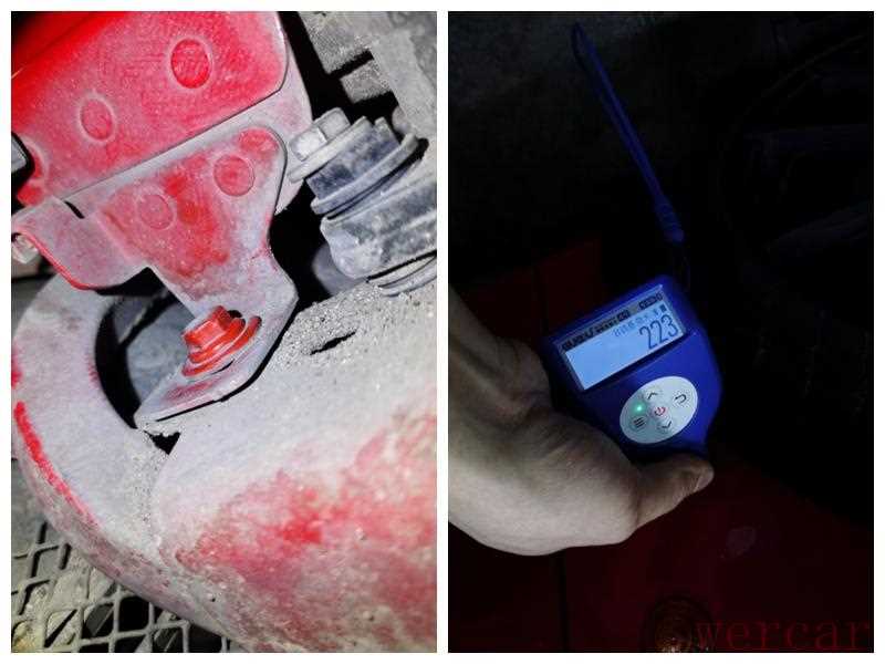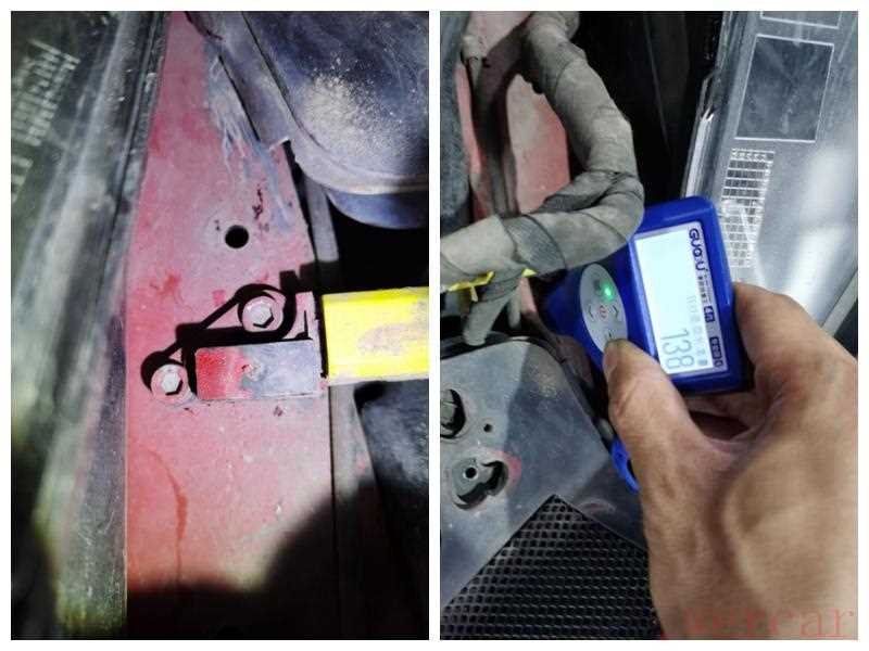 接着检查左前车体骨架,左前纵梁部位,发现左前纵梁上面传感器都是红色油漆,漆膜仪测量数值也比较高,但是没有钣金情况。