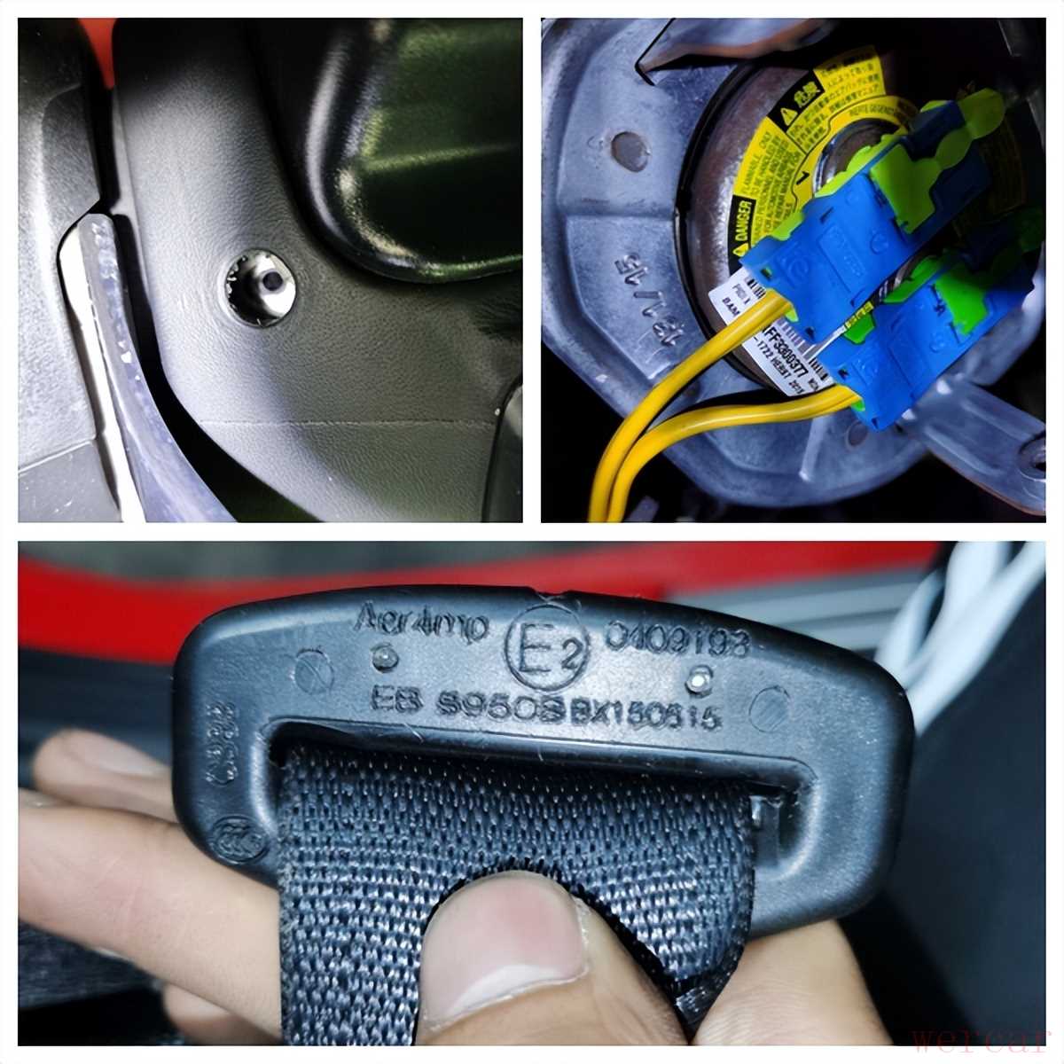 驾驶员安全气囊有拆卸痕迹,所以直接检查内部的生产日期,发现是2015年的所以气囊是没有弹出更换的,安全带是2015年出的厂没有更换情况,那说明右前侧的事故并不是很大,但很遗憾,右前纵梁有变形终究是属于事故车了,车辆的价值会受到影响。