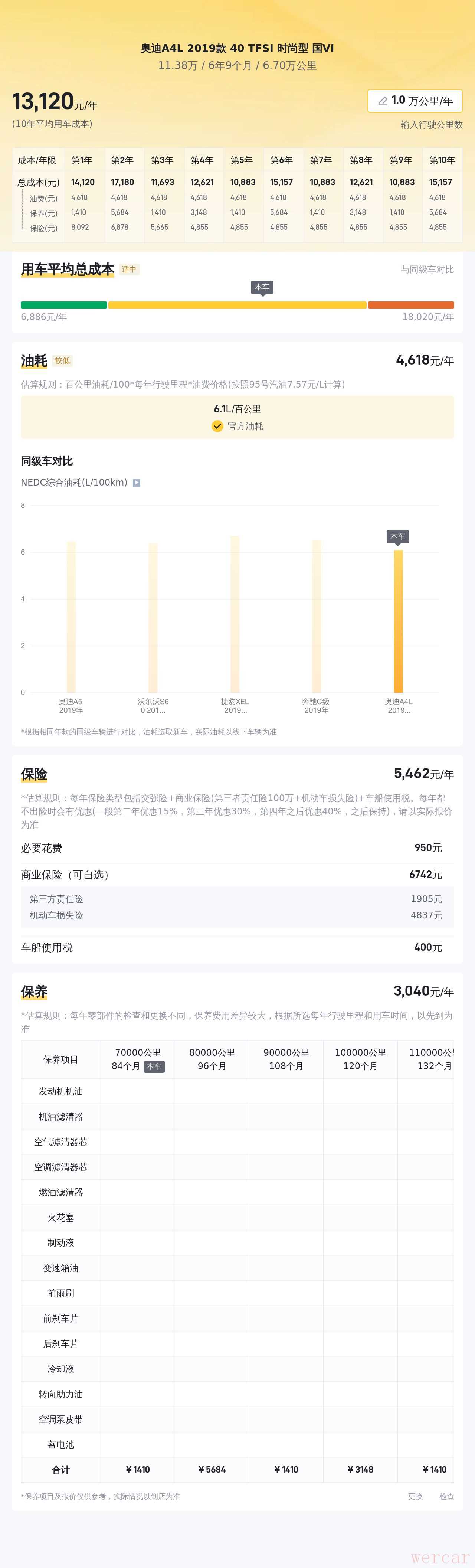 这台奥迪A4L 2019款 40 TFSI 时尚型 国VI的10年平均用车成本大约在13400元/年,与同级别车相比处于适中区间,完全可以接受。