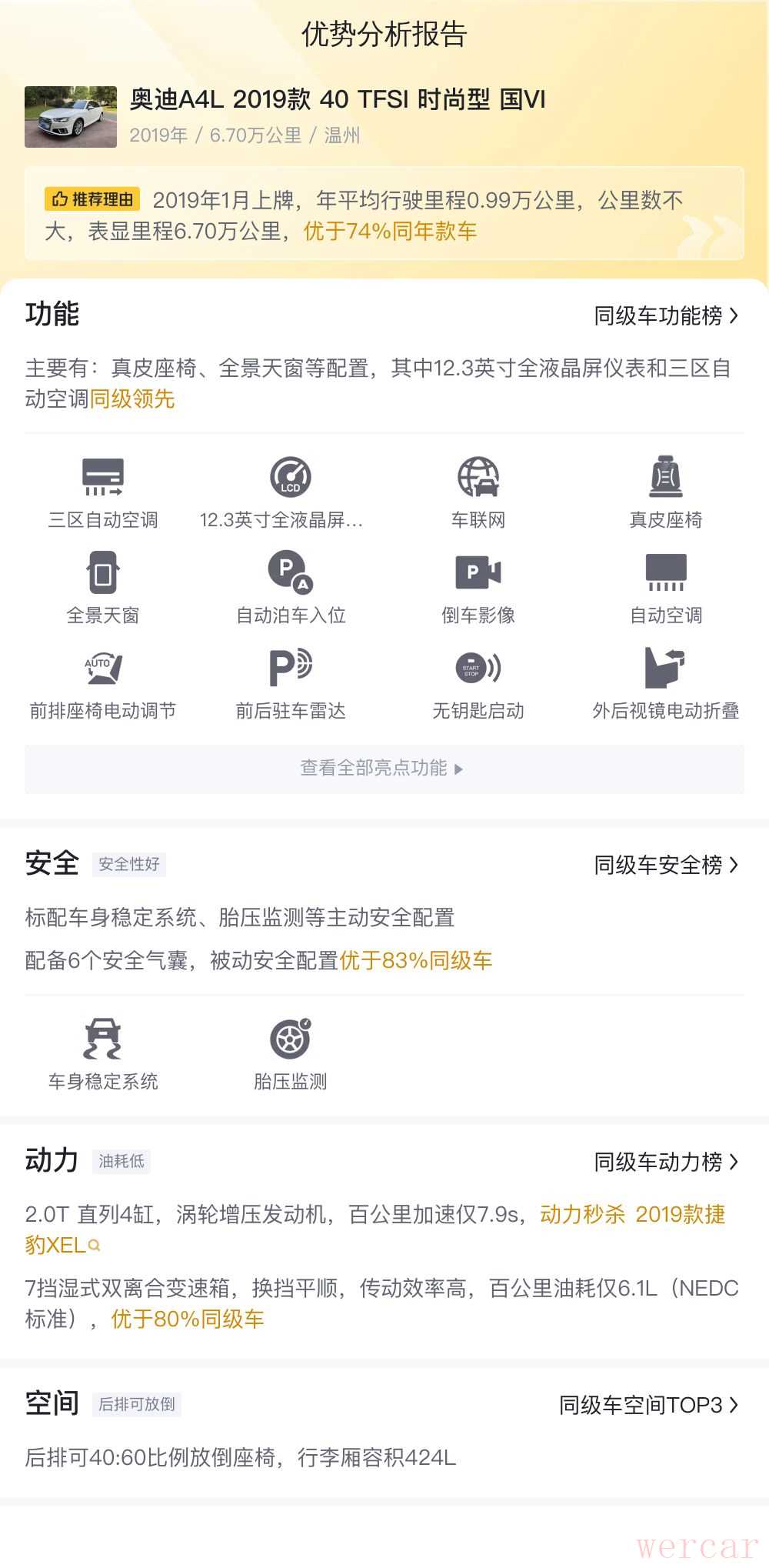 我们来分析一下这款2019款奥迪A4L,6.7万公里,参考价11万多的车,作为家用代步是否是个好选择。