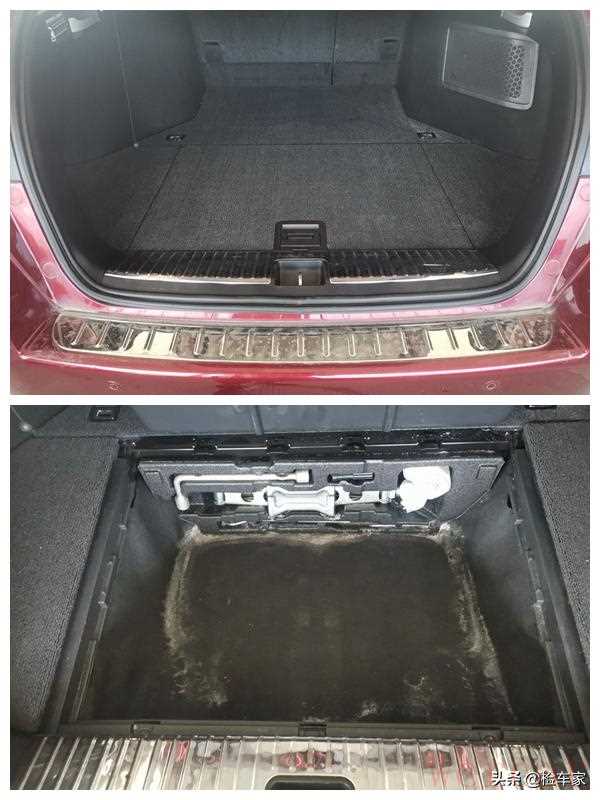 后备箱也有进水发霉的情况,掀背式后备箱,表面看虽然很大很干净,但掀开盖板就能看到里面的霉点和少量泥沙,估计也是洗车造成的。