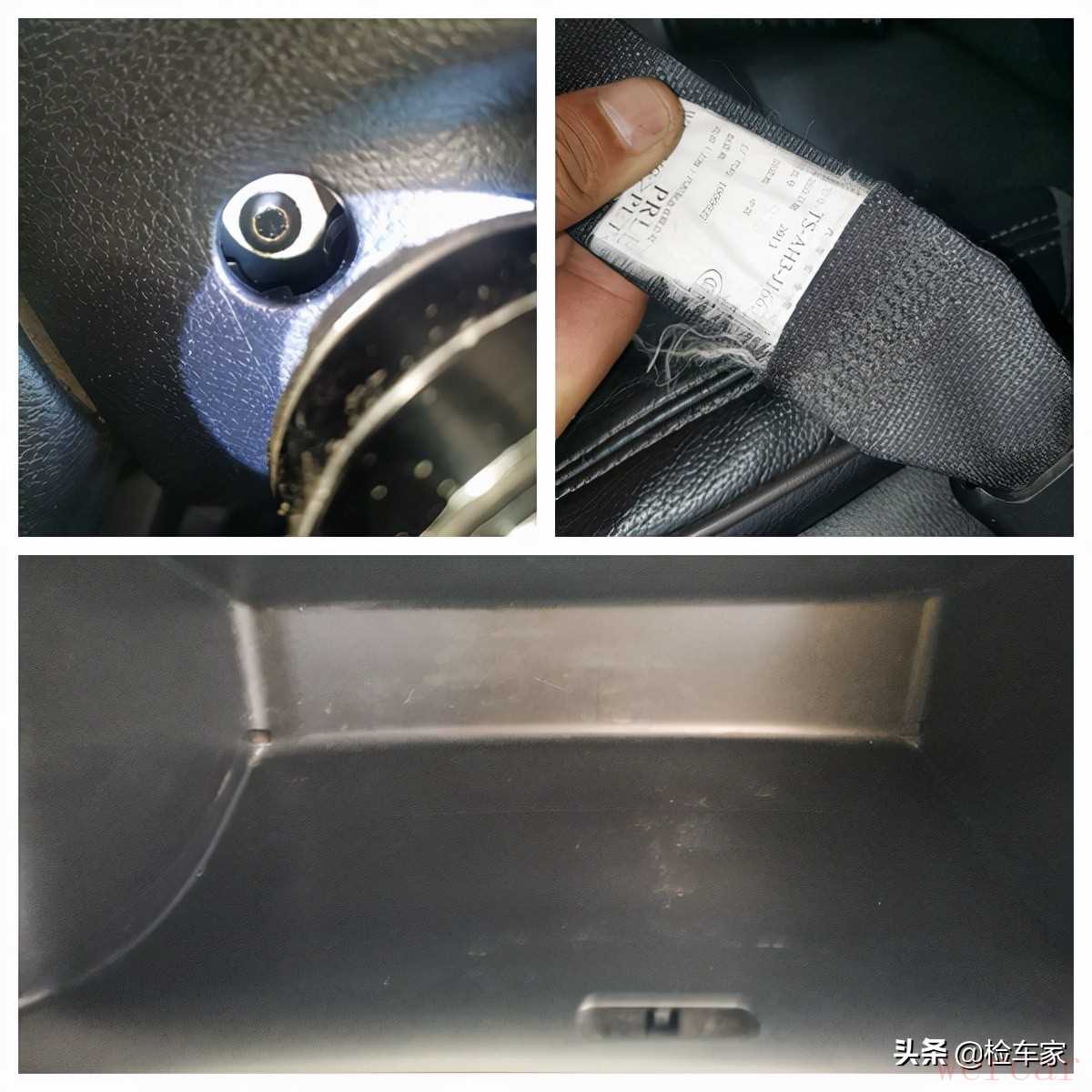 还是先从事故方面入手,看了主驾驶安全气囊拆过,难道前面的小碰撞触发气囊弹爆了?但是看了仪表台和储物箱都没有修复的迹象,副驾驶气囊也没动过,主驾驶安全带也是没问题的,只是磨损严重,安全带标签的边角都开线起毛了!