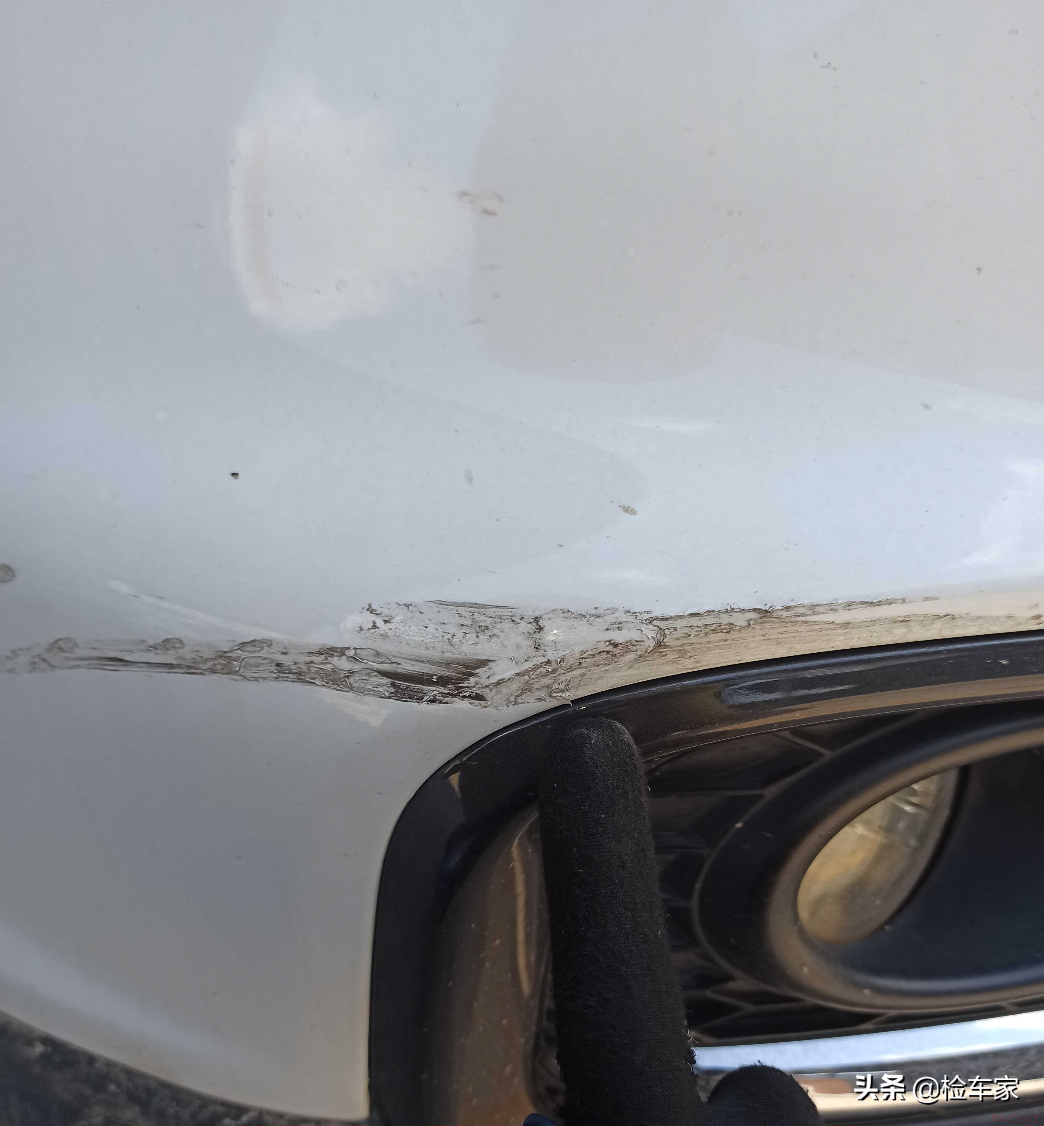来到现场看到车辆已经等着我们过来检测了,我发现车辆贴了白色的膜,原车也是白色的,还改装了轮毂和红色的刹车卡钳,看得出来原车主也是爱车玩车的人。绕车一圈看到前杠有剐蹭,膜也刮破了,本来喷漆修复要只需两三百块钱左右,要重新贴膜的话又得多花几百块了。接下来拿出专业设备检测漆面数值。
