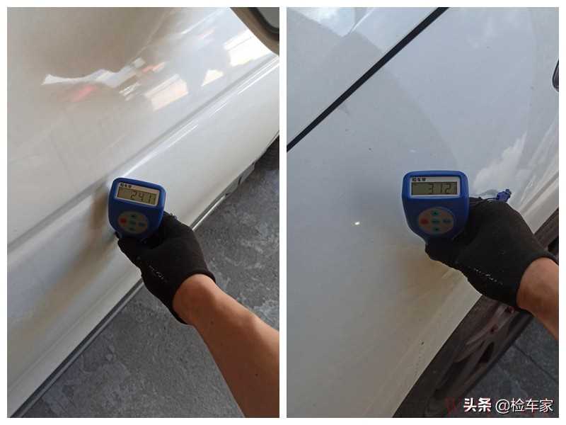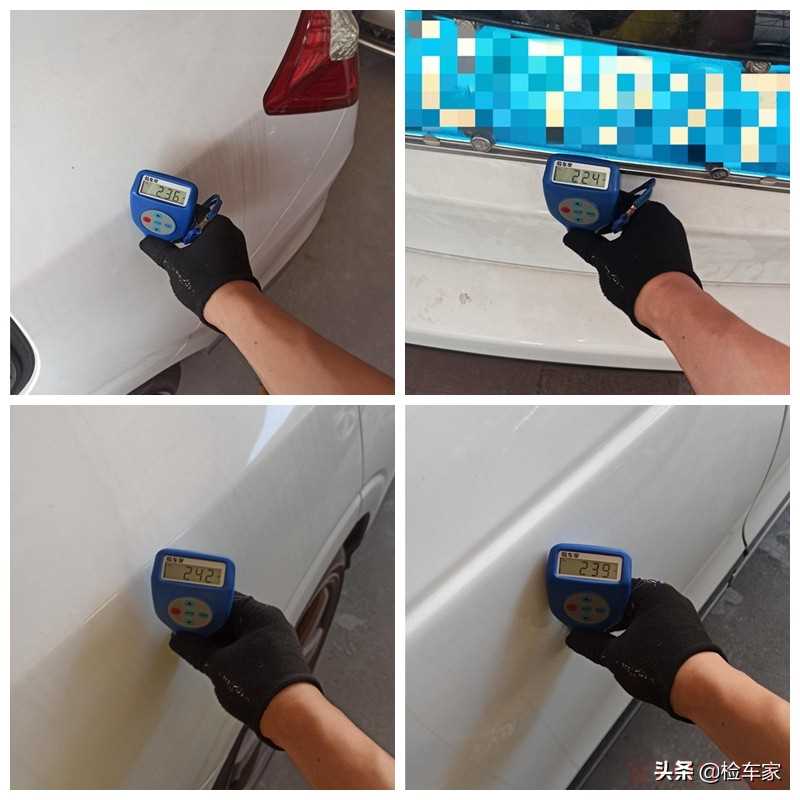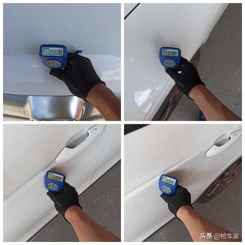 由于全车贴膜,整体的漆面数值很高一点,基准数值大概在230左右,可以看到机盖漆面数值正常,没有钣金喷漆;左前叶子板漆面数值偏高,不用多说是喷漆了;左前门漆面数值正常,没有钣金喷漆;左后门漆面数值正常,没有钣金喷漆。
