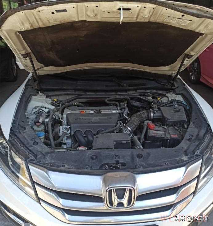 接下来仔细检查发动机变速箱以及各附件有无拆卸维修,发现机脚胶固定螺丝,正时前盖,发电机固定螺丝无拆卸痕迹;排气管无拆卸痕迹;变速箱支架以及散热器固定螺丝均无拆卸痕迹;各水管附件均无拆卸痕迹;仔细检查下来也没有发现漏油漏水现象。发动机整体的表现也还是很不错的,毕竟是本田的看家本领了。