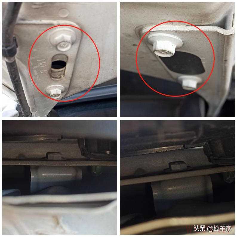 发动机舱部分,我们一般先看机盖,因为如果前部有重大事故,机盖肯定是躲不了的。所以首先看机盖两侧固定螺丝有无拆卸痕迹,这个螺丝很好看,如果有过拧动的话一定会在螺丝上留下痕迹,因为它这个是喷过漆的。当然有些拆卸过后会进行重新喷漆,稍微懂车的一般也都能看出来,我们这种专业的二手车检测师就更不用说了。而这台车的机盖固定螺丝可以看出来是没有动过的,并且结合漆面数值胶边焊点,可以确定是原厂机盖;叶子板两侧的固定螺丝同样无拆卸痕迹,结合漆面数值来看,确实叶子板只有喷漆,并无拆卸更换。