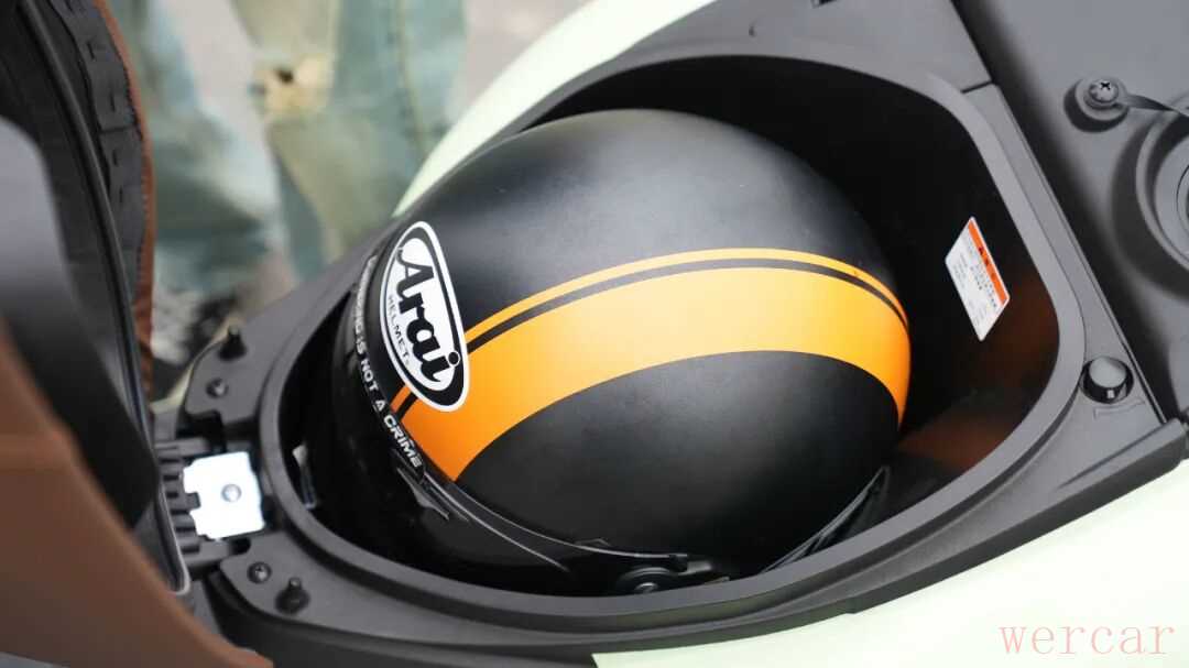 由于油箱的后置,让整个后储物空间看起来较小,但由于桶深与座垫的巧妙设计,让它能够放下一点ARAI NEO全盔。