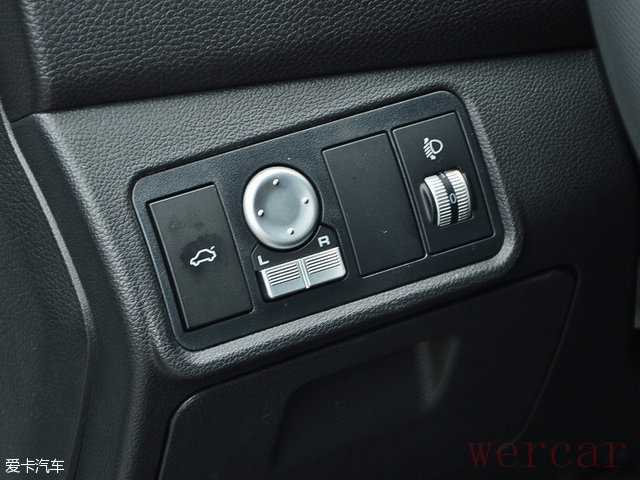 方向盘左下方有一排控制键,从左到右依次是后备厢开启按键、电动后视镜调节以及大灯高度调节。