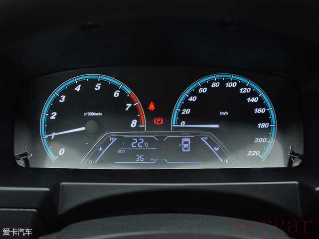 仪表盘采用了双圆式设计,造型比较简单。蓝色背光搭配白色数字和指针,读取起来非常方便。下方的行车电脑显示屏能够显示多种信息,实用性很强。