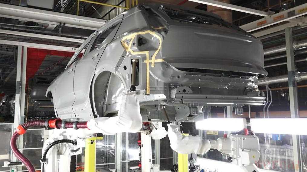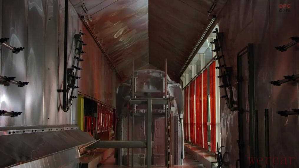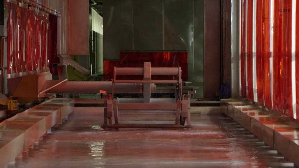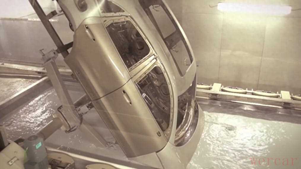 车身在一个巨大的电泳池中浸泡,通过电场的作用,使带电的漆料粒子均匀地吸附在金属表面,从而形成一层漆膜,进一步增加防腐性能。