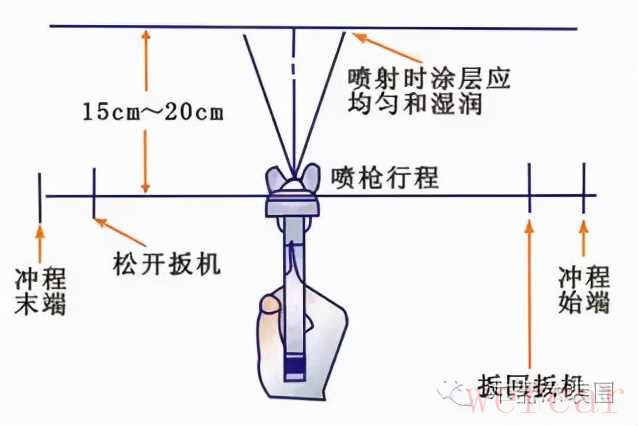 喷枪的枪口与被涂面垂直,喷涂时以手臂运作,不能以手腕运作,因为手臂运作可使喷枪保持垂直平行的运动,而手腕运作会产生以手腕为支点的圆弧形动作,使喷涂不匀;