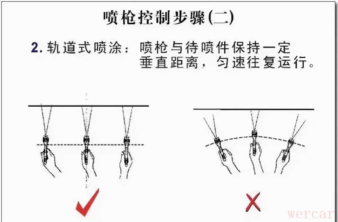 喷涂时手、眼、身、步法均要到位,缺一不可,枪走到哪里,既要找到枪去的位置,又要注视已喷过涂膜的形成情况和漆雾的熔点,以身体的移动协助膀臂的移动;