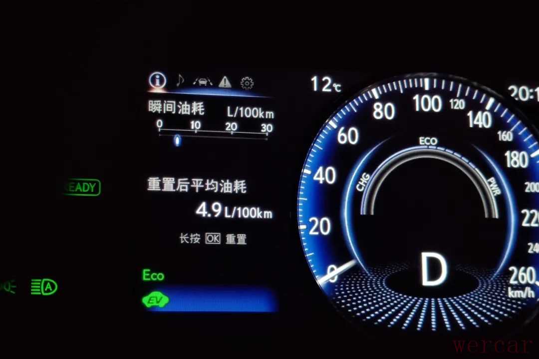 按下POWER键之后,没有习惯的发动机轰鸣声,你只需看到蓝色背光的半液晶仪表中“READY”字样出现,就可以挂挡出发了。只要电池能够保持一定的电量,最拥堵的时候就是最节油的时候,因为此时车辆可以完全由电动机驱动。