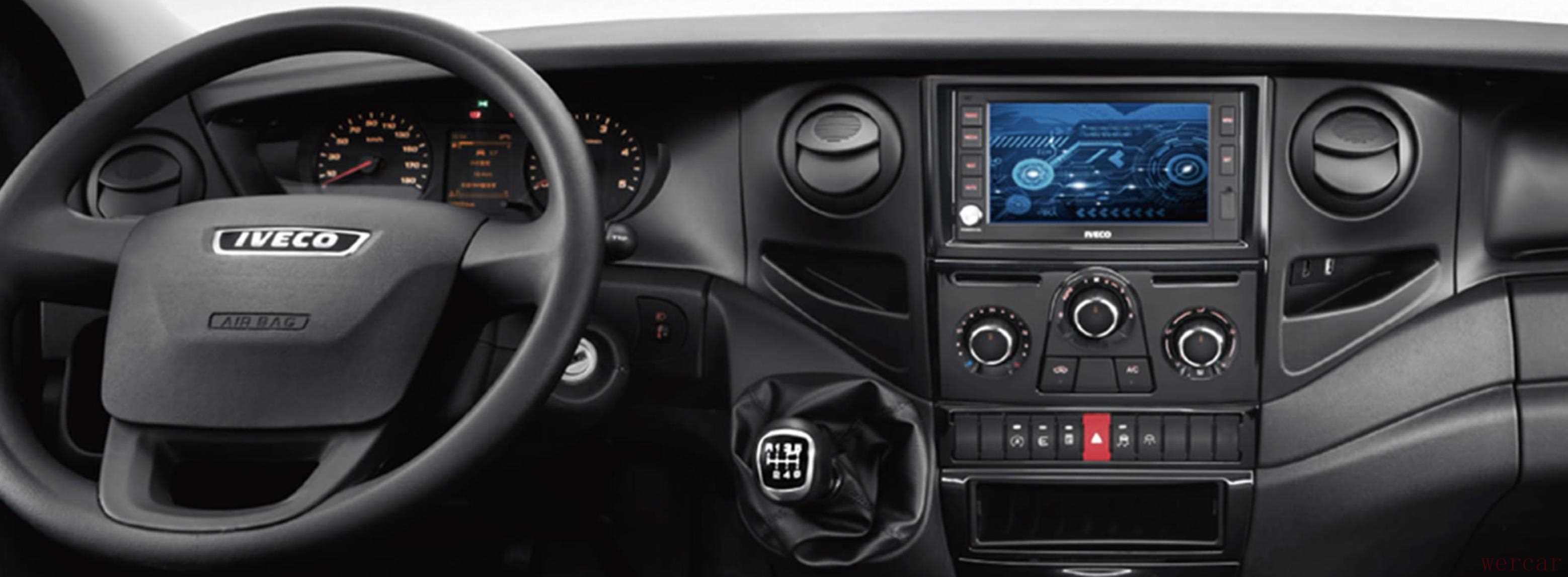 从配置角度来看,依维柯欧风3款车型配置水平保持一致,均可提供四轮盘刹、ESP车身稳定控制、倒车雷达/影像、中控锁、遥控钥匙、内置行车记录仪、导航、9英寸中控屏、蓝牙、自动空调等配置。