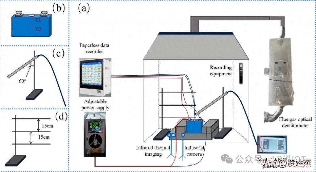 在 35℃恒温环境下,设置 0.5C(16A)至 1.5C(48A)共五组充电倍率,每组工况重复测试 2 次。通过多模态设备采集数据:- 温度:电池表面(双 K 型热电偶均值)、烟气层(三热电偶阵列),精度 0.1℃