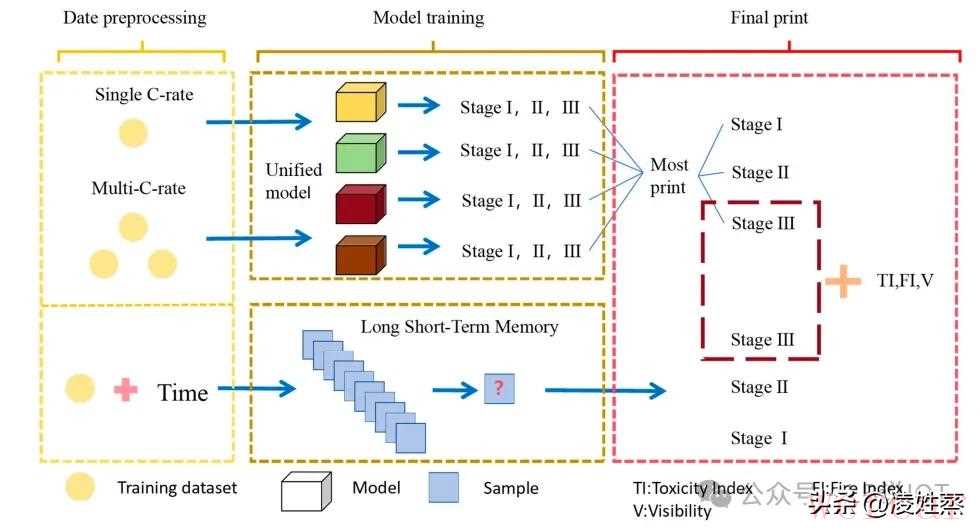 本文开展 0.5C-1.5C 五组梯度充电倍率实验,采集温度、电压等多维度数据,构建 "安全阀开启前 - 电压反弹前 - 热稳定" 三阶段热失控模型,精准捕捉各阶段特征信号。研究中创新融合随机森林、梯度提升树、SVM 与 MLP 构建融合模型,在多倍率场景下泛化能力强,最高准确率达 99.39%;同时采用 LSTM 时序模型进行动态时序建模,单倍率准确率超 95%。针对严重热失控,提出毒性指数(TI)、易燃指数(FI)、能见度(V)三维应急决策矩阵,形成 "多模态信号采集 - 智能阶段预警 - 量化应急响应" 全流程安全管理体系,为磷酸铁锂电池全生命周期安全保障提供理论与实践方案。1. 正文