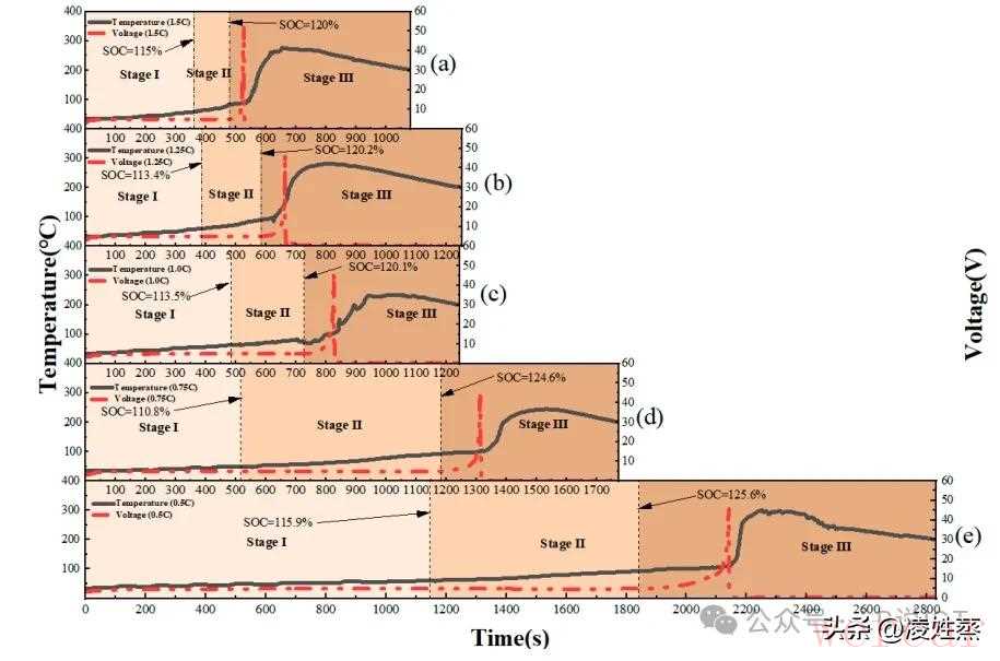 根据电压、温度核心参数,结合气体成分与物理形态变化,将过充热失控过程划分为三阶段:2.2.1 阶段 I:过充启动至安全阀开启