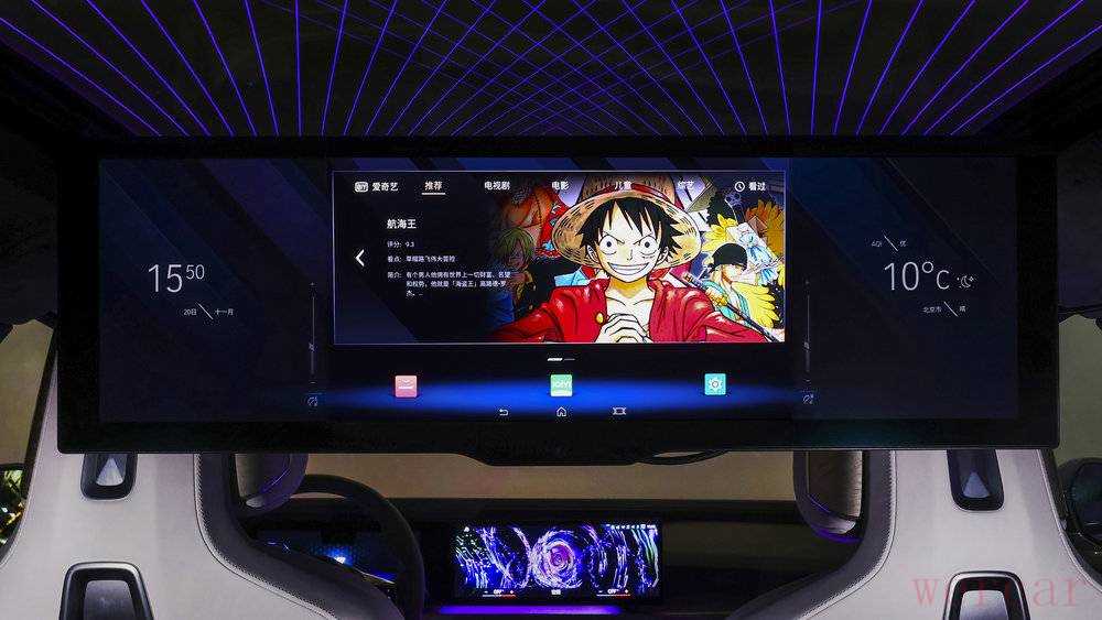 这块屏幕平时折叠在天窗的位置,用户可以通过语音和车内虚拟按键展开。结合最多36个扬声器,总功率高达1965W的宝华韦健钻石音响,你完全可以省下汽车电影院的钱,坐在车里通过腾讯视频、爱奇艺观赏各类影片。