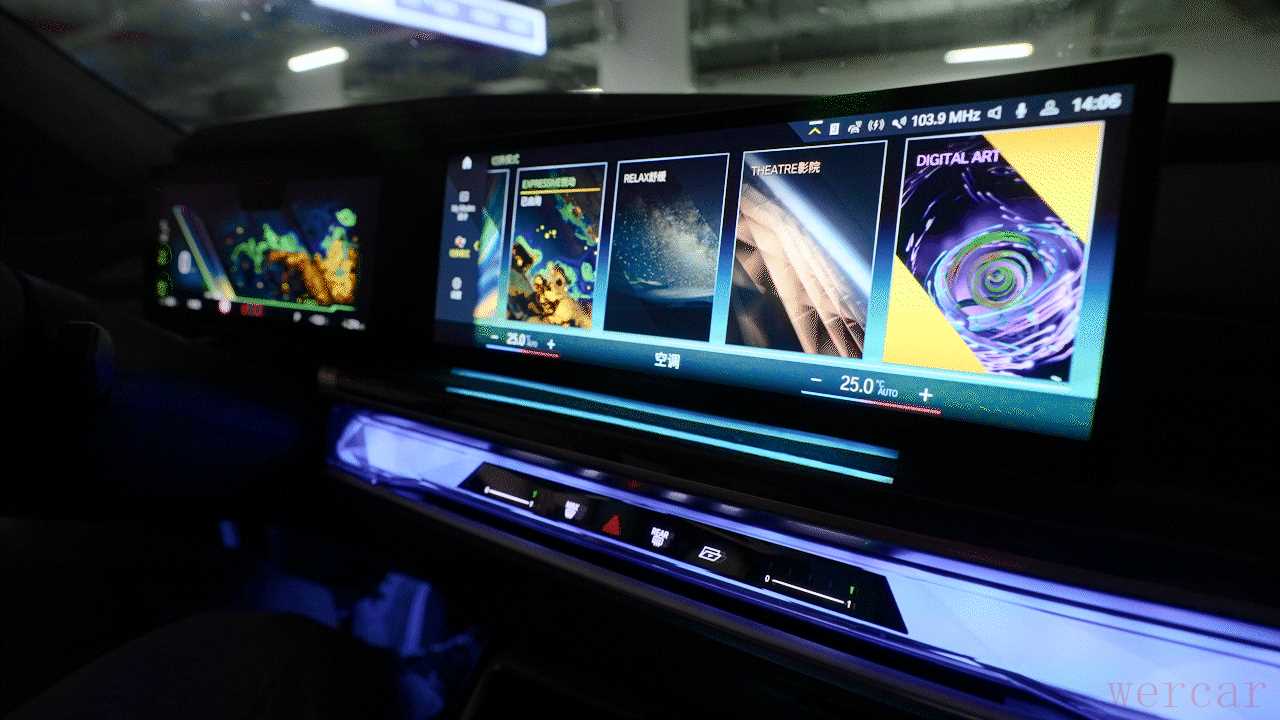 更重要的是,通过后排这块小屏幕还可以调节整车灯光风格。用户可以选择悦动和舒缓模式一键调节灯带和后排屏幕UI,并打开座椅按摩。同时,用户也可以通过影院模式降低车内氛围灯亮度,打开后排屏幕欣赏影片。另外,宝马还提供了一个颇具未来感和设计感的“数字艺术模式”,让你浅浅地接触下元宇宙。