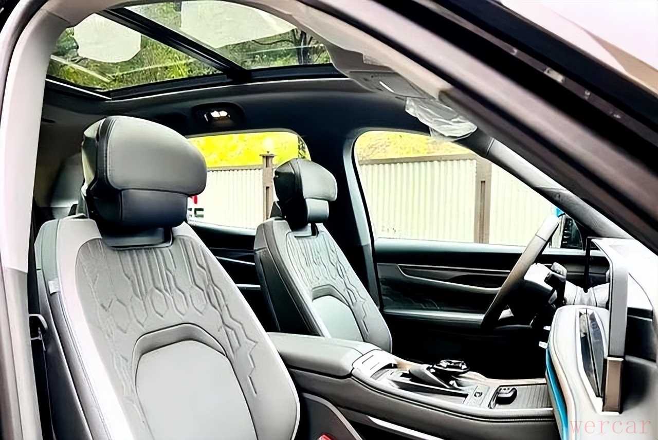 内饰堆料足,软包中控加真皮方向盘,12.8英寸竖屏反应快,语音开天窗挺顺手。