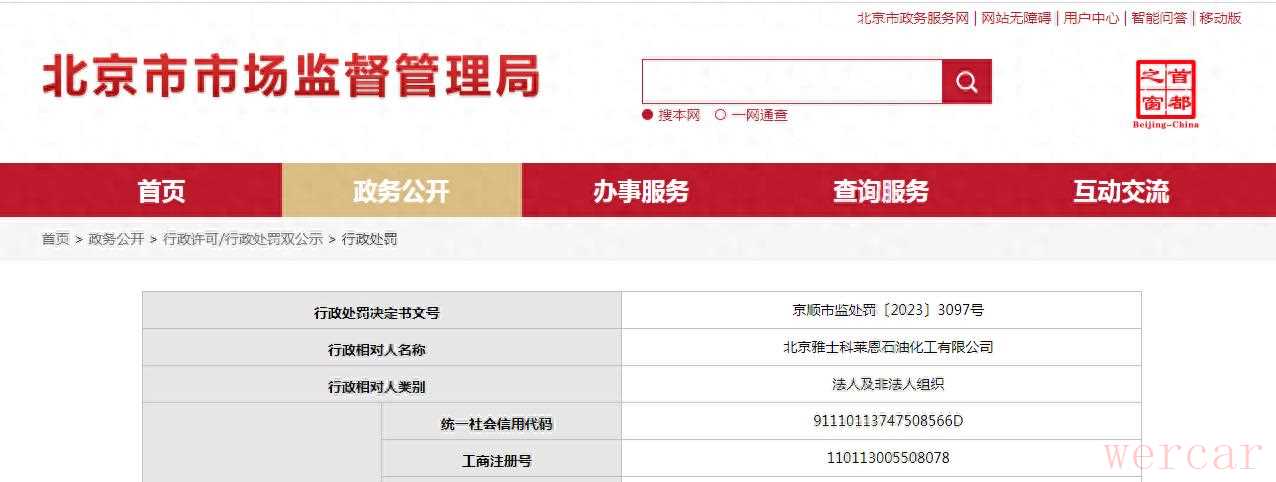北京雅士科莱恩石油化工有限公司因违规被处以5400元罚款