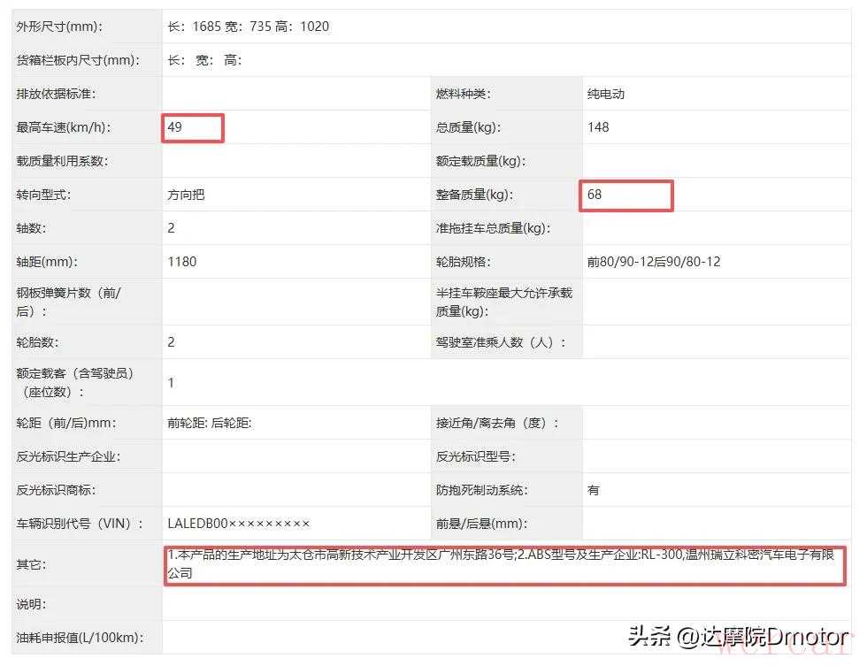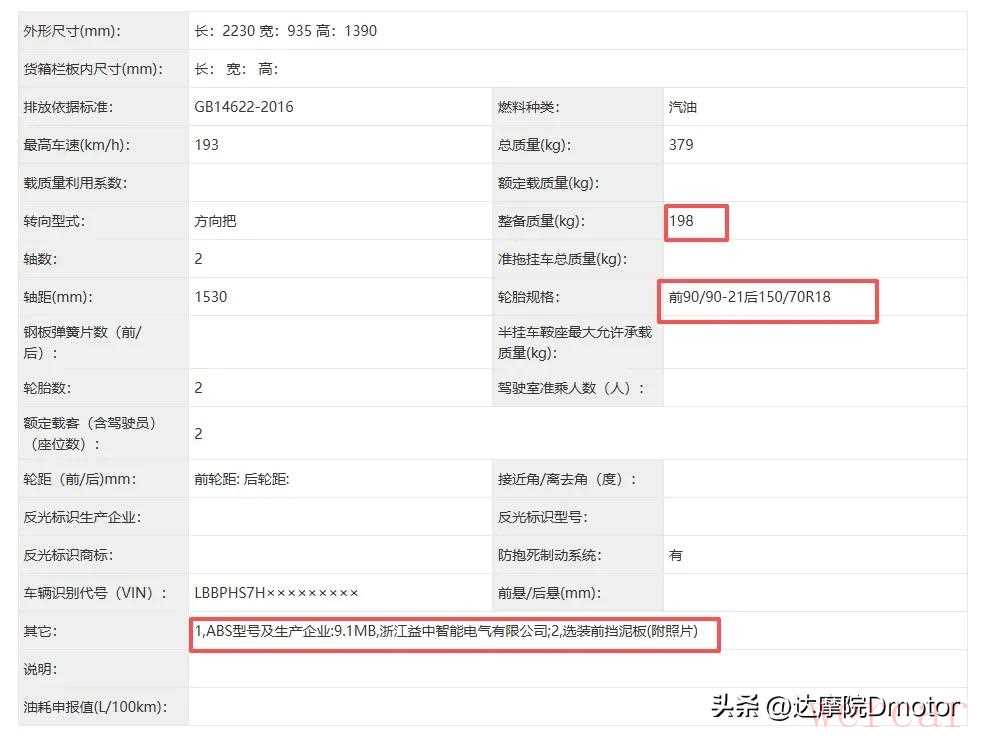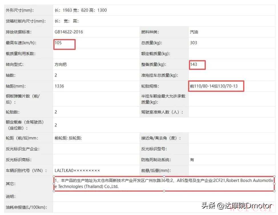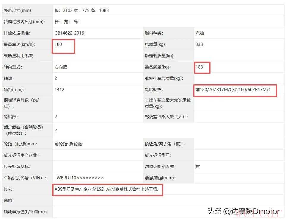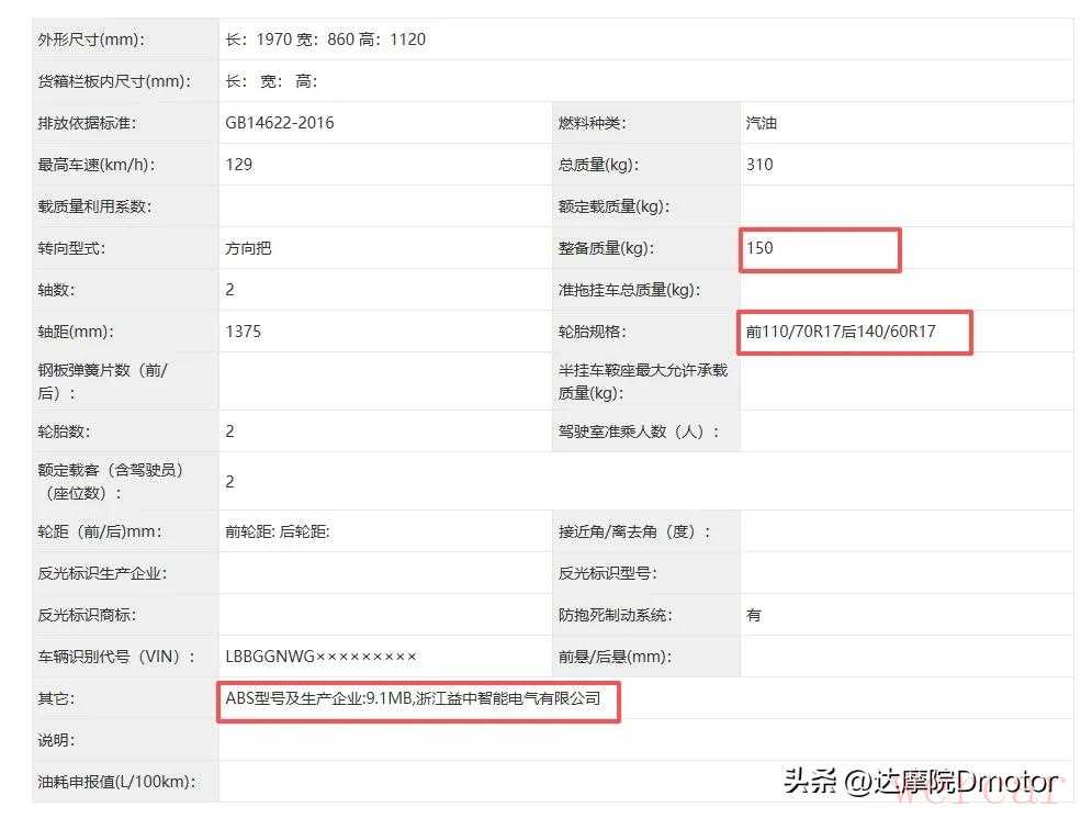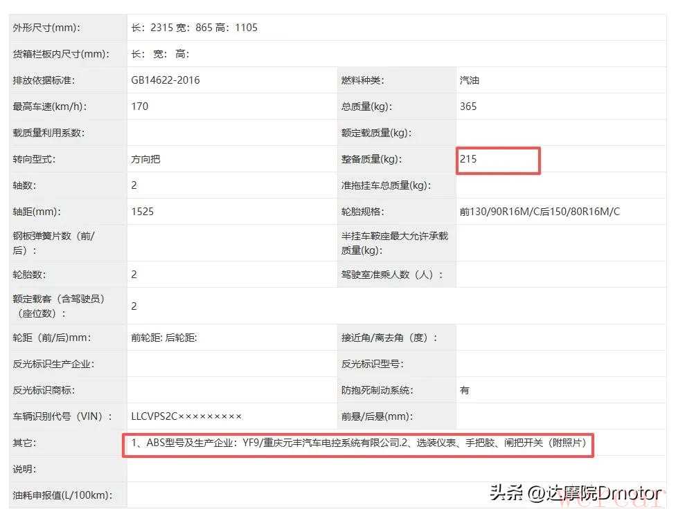 据申报资料显示车辆的整备质量近为68KG,轮胎尺寸为前后12寸搭配正新的轮胎,从图片和资料看,该车是标配有ABS!