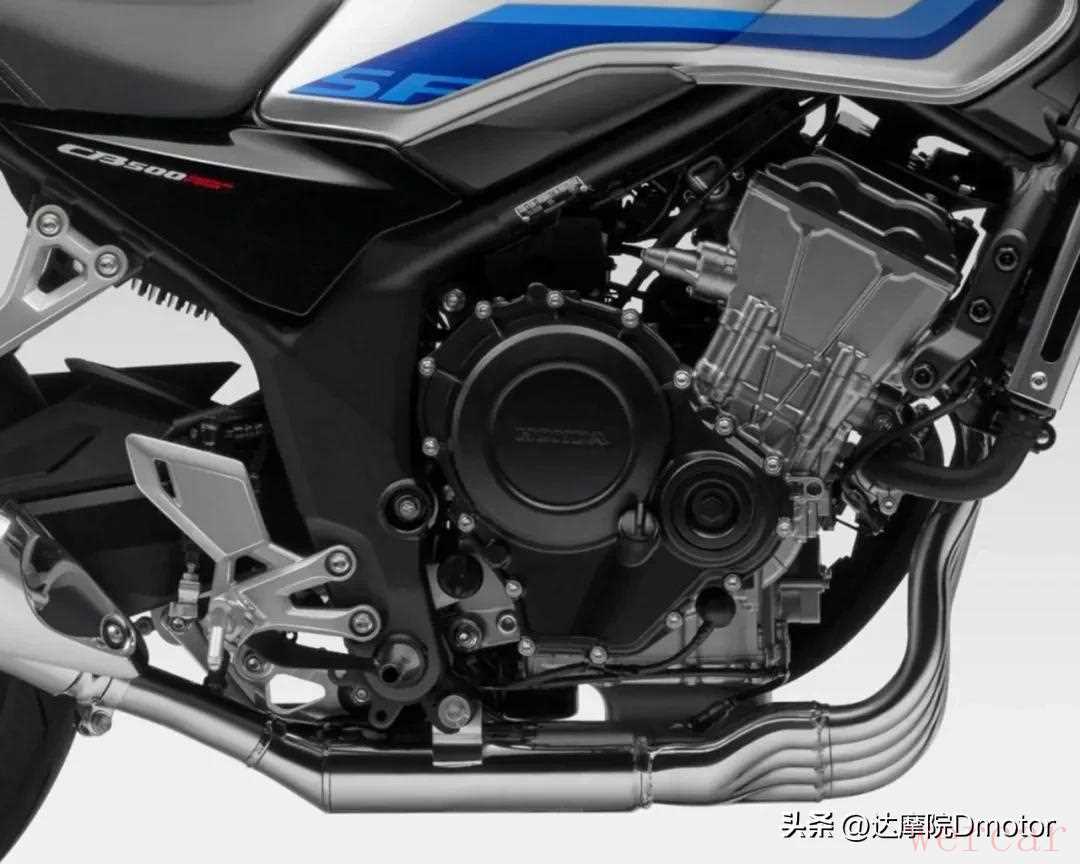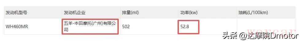 首先车辆搭载的是五羊本田自产的WM460MR直列四缸发动机,实际排量502cc,输出最大功率52.8kW(约72匹)!