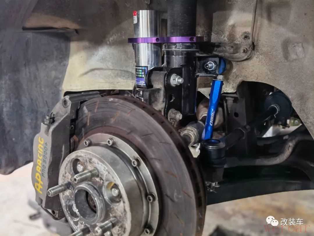 "首先是行走及操控方面,换上了D2 2Way绞牙避震、雅泛迪轮毂、AP 5000+PRO卡钳+赛用刹车皮、订制前可调鱼眼下摆臂、后可调4连杆,很明显要将这辆车变得战斗起来。"