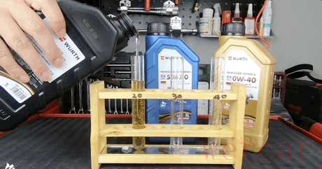 这样是为了直观的看到,3种机油哪个流得最快。结果很明显,0w机油一马当先,5w机油其次、10w机油最慢。这是因为根据SAE的机油黏度标准。0w意味着可以在-35℃以上保持动性。5w可以在-30℃以上保持流动性。而10w只能在-25℃以上保持流动性。