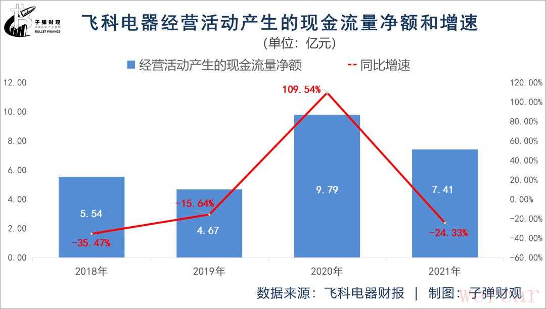 值得一提的是,飞科电器还曾多次因产品质量问题被相关监管部门点名。2017年6月,广东省质量技术监督局公布的《2016年广东省皮肤及毛发护理器具等6种产品质量专项监督抽查结果》显示,飞科卷发器在连续骚扰电压这一项目中不合格;同年11月,上海市消保委发布了对25款智能扫地机器人的测试结果,飞科电器一款型号为FC9601的产品在测试过程中发生了故障;同年12月,赣州市工商局官网发布的2017年度流通领域小家电类商品质量抽检结果显示,飞科电器一款型号为FS623的电动剃须刀因标志和说明不符合标准被判定为不合格;2019年1月,江苏省市场监督管理局官网发布了2018年第一阶段电动剃须刀抽检结果,其中,标称“上海飞科电器股份有限公司”生产的1批次博锐电动剃须刀(2018.04.25 PS168)样品被检出电源连接和外部软线-60项目不合格。不仅如此,飞科电器也陷入现金流吃紧的窘境。财报显示,2021年飞科电器经营活动产生的现金流量净额为7.41亿元,较上年同期的9.79亿元减少24.33%。而且,此前3个年度除了2020年飞科电器经营活动产生的现金流量净额增速为正值,其他两个年度的这一数值均为负,分别为-35.47%和-15.64%。