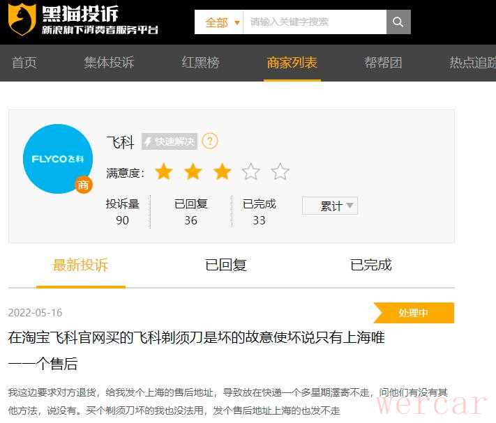 如果把库存看作压力,那么库存增加相当于压力增加。按照这个逻辑,飞科电动剃须刀和电吹风库存量的激增,意味着公司清理旧库存所释放的压力远不及其新库存带来的新压力。事实上,库存超过一段时间之后就要进行减值,因为超过时间的库存产品必须低价处理,而中间的损失就一定要计入资产减值损失。在此之外,飞科电器也面临口碑信誉下滑的状况。「子弹财观」注意到,在黑猫投诉平台上,涉及飞科电器的投诉合计达到90条,而网友们对飞科电器的投诉主要为产品质量差、售后服务差、退款难以及不发货等。