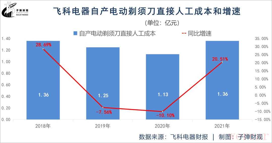 此外,飞科自产电动剃须刀直接人工成本的上升也抑制了其扣非净利润的增长。飞科电器披露的财报信息显示,2021年该公司自产电动剃须刀的直接人工成本为1.36亿元,较上年同期的1.13亿元增长超过20%,达到20.51%。而且,此前3个年度飞科自产电动剃须刀的直接人工成本增速“有正有负”,平均增速达3.68%。