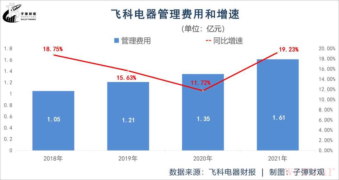 实际上,上涨的不止飞科电器的营销费用,也包括其管理费用。根据财报,2021年飞科电器的管理费用为1.61亿元,较上年同期的1.35亿元提升近20%,达到19.23%。而且,此前3个年度飞科电器的管理费用均同比正向增长,平均增速达15.37%。