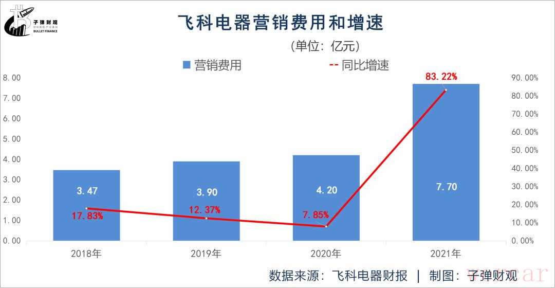 而飞科电器扣非净利润增长乏力的原因,不外乎两点:营收下滑和成本陡增。先看营收,飞科的电工电器业务营收在减少。根据已公开的财报,2021年飞科的电工电器业务营收为0.27亿元,较2020年同期的0.35亿元下滑超过20%,达到23.67%。再看成本,飞科电器的营销费用在攀升。据飞科电器此前发布的财报显示,2021年该公司的营销费用为7.70亿元,较上年同期的4.20亿元上涨超过80%,达到83.22%。而且,此前3个年度飞科电器的营销费用增速均为正值,分别为17.83%、12.37%和7.85%,平均增速达12.68%。