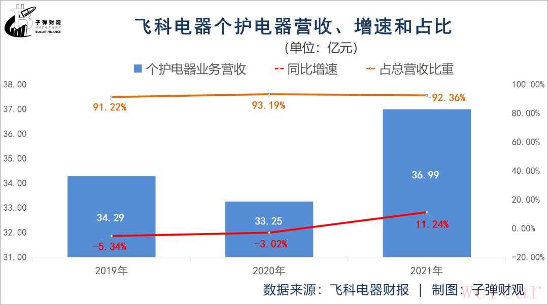 而飞科电器的营收增速之所以“由负转正”,一个重要原因是,其第一主业“个护电器”的营收在上涨。根据财报,2021年飞科的个护电器业务营收达到36.99亿元,较上年同期的33.25亿元增长11.24%。而在此前两个年度,飞科的个护电器业务营收增速分别为-5.34%和-3.02%。除此之外,最近3个年度,飞科的个护电器业务为公司贡献的营收比重均不低于91%,依次为91.22%、93.19%和92.36%。