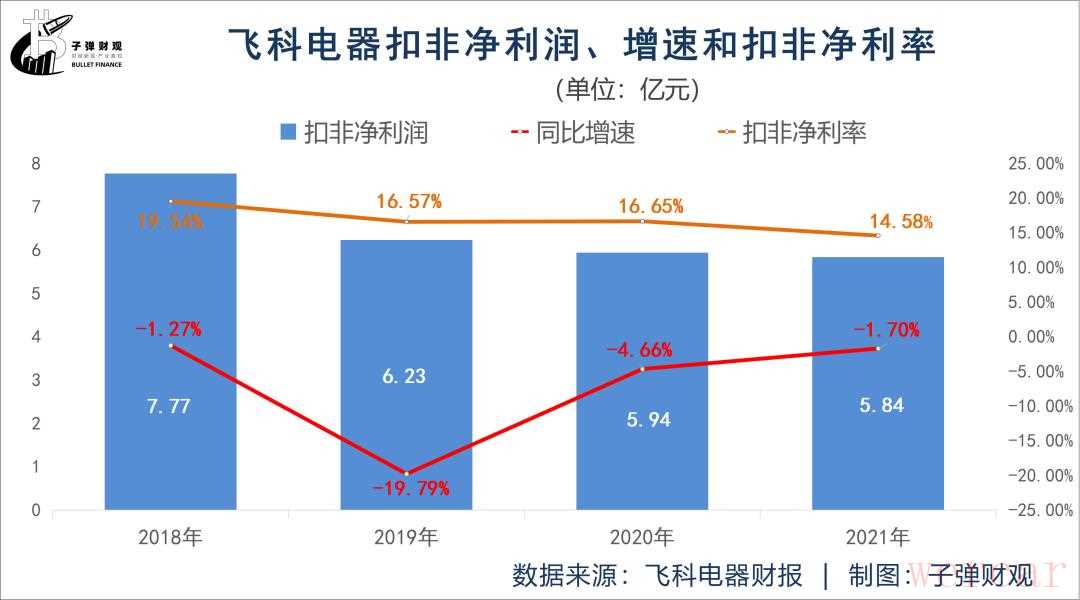 即便在营收方面有不错的表现,但从总体来看,飞科电器的财务数据并非“一片大好”。就拿扣非净利润来说,飞科电器披露的财报信息显示,2021年该公司的扣非净利润为5.84亿元,较上年同期的5.94亿元下降1.70%。而且,此前3个年度飞科电器的扣非净利润增长率均为负值,分别为-1.27%、-19.79%和-4.66%。另外,在过去的4个年度里,飞科电器的扣非净利率一直偏低,最高不超过20%,最低下探至14.58%。