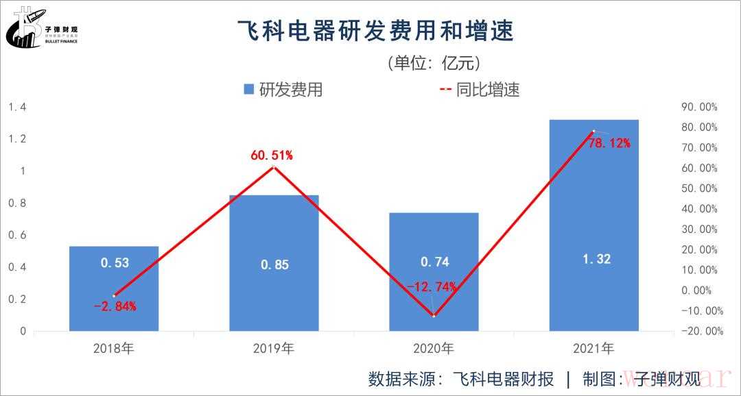 除了管理费用,飞科电器的研发费用同样在增加。财报显示,2021年飞科电器的研发费用为1.32亿元,较上年同期的0.74亿元增长近80%,达到78.12%。而且,此前3个年度飞科电器的研发费用增速“有正有负”,平均增速达14.98%。
