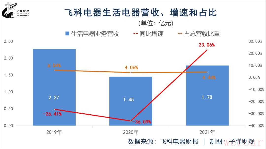 此外,飞科的营收增长率向好也跟其生活电器业务营收增加有关。财报显示,2021年飞科的生活电器业务营收为1.78亿元,较上年同期的1.45亿元上涨23.06%。而且,在过去的3个年度里,飞科的生活电器业务为公司贡献的营收比例一直在4%以上,分别为6.04%、4.06%和4.44%。