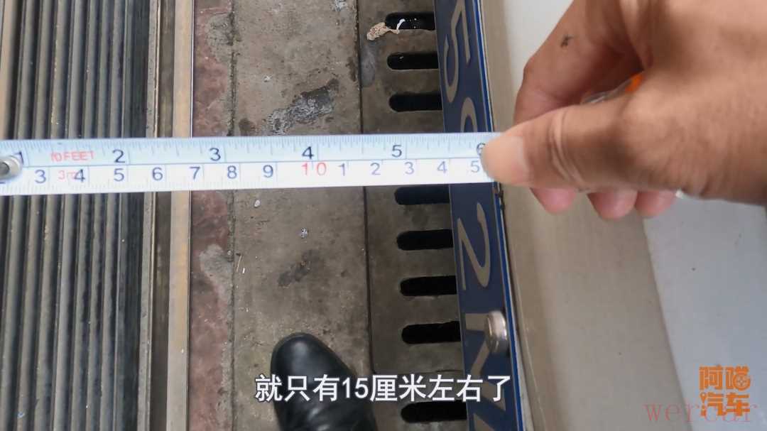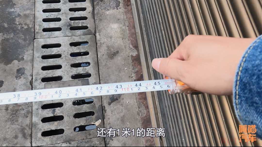 我们下车测量下车子距离墙壁的距离,可以看到车与墙之间的距离只有15厘米左右,这个距离就已经很近了。