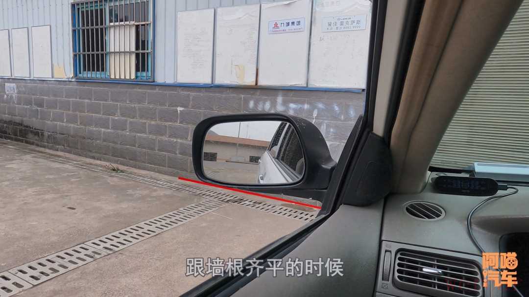 第一种方法,我们可以以后视镜为参照物,将车子朝着墙壁开过去,当左侧后视镜下沿与墙根齐平的时候,我们可以看到,车子离开墙壁还有一米一的距离。