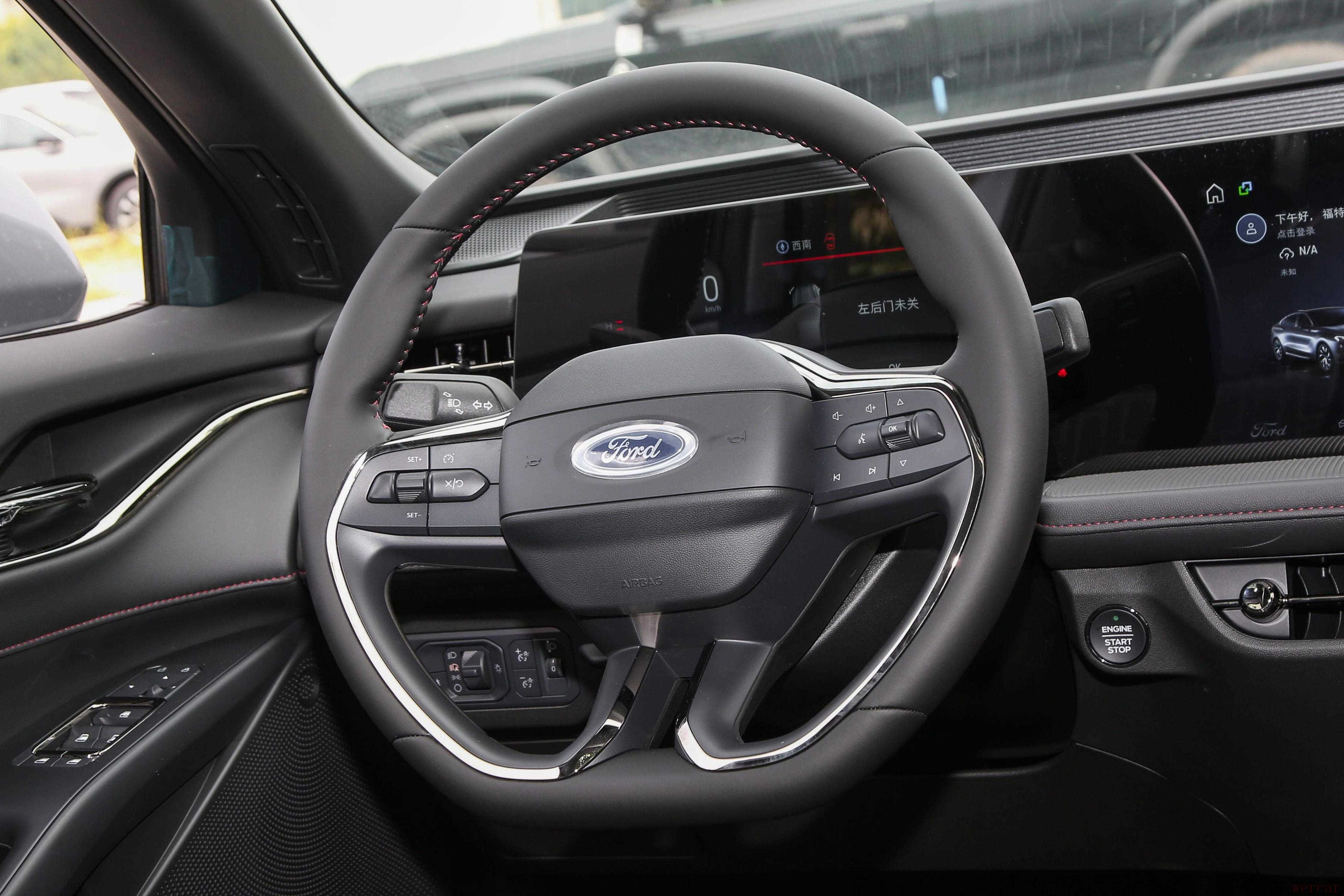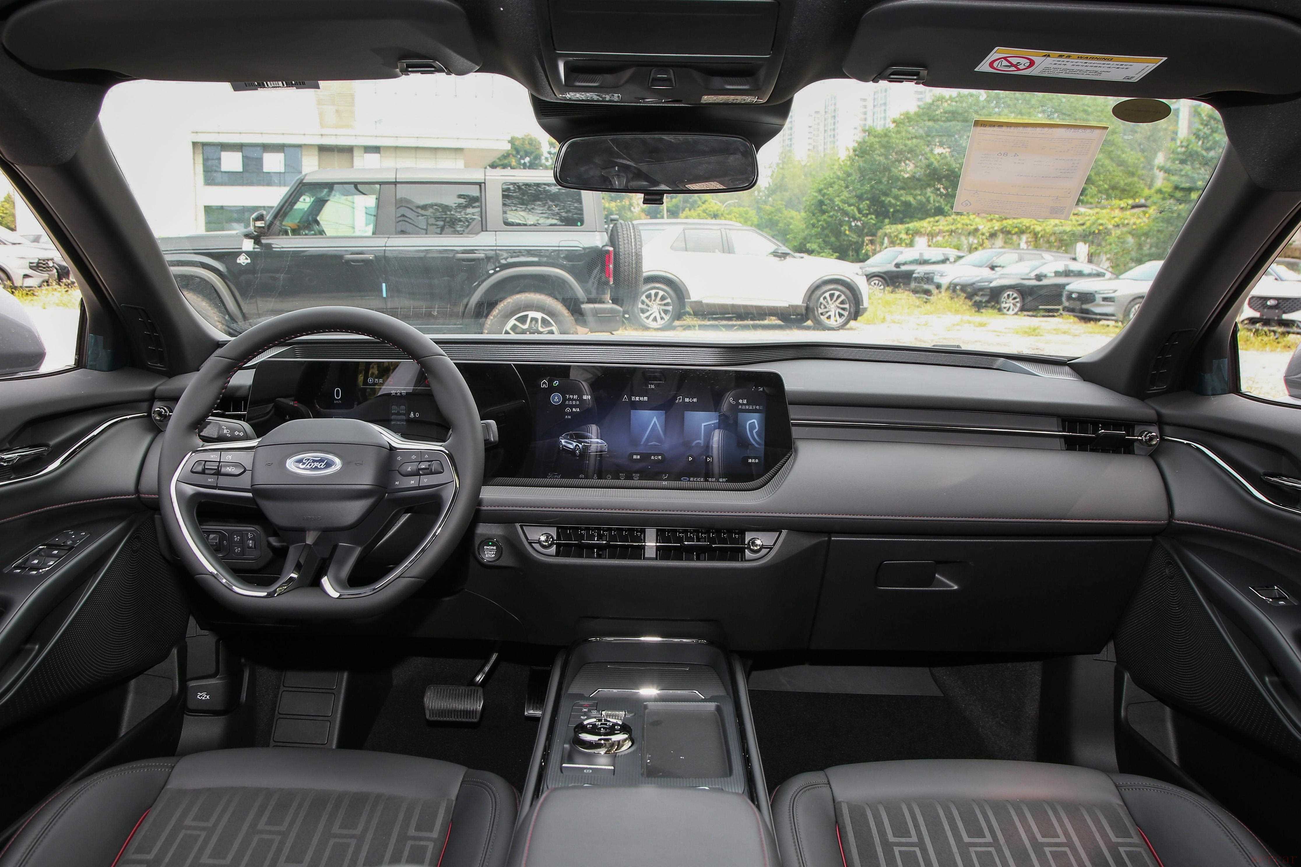 内饰方面,内饰的设计兼顾了实用性和科技感,日常操作起来非常顺手。方向盘采用皮质材质,握感舒适,还支持四向手动调节,多功能按键布局合理,驾驶者在行驶过程中操作多媒体、巡航等功能很方便。旋钮式电子换挡,又省地方又便捷。车内大量采用软性材质和皮质包裹,触感柔软细腻,品质感很足。比较吸引人的还是一米多长的贯穿式联屏,这个联屏由27英寸4K中控屏与12.3英寸全液晶仪表盘组成,看上去有种震撼感,内置SYNC+ 2.0智行互联系统,支持分屏操作,集成语音识别、百度地图,卫星导航,手机互联映射,4G网络,车联网,OTA升级,蓝牙/车载电话等多项功能,内置高通骁龙820A芯片,操作起来很顺滑,反应灵敏且迅速。全景天窗有效提升车内通透感与视野开阔度。实际体验中,用户普遍反馈其空间布局兼顾家庭出行与个人驾控需求,既保证了运动化座舱的驾驶沉浸感。