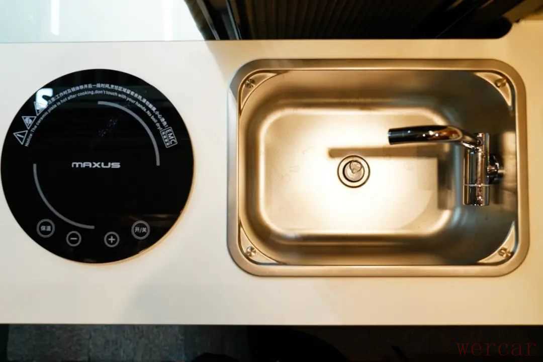 厨房区域采用一体式橱柜设计,配备有不锈钢水槽、可折叠式水龙头、电磁炉、微波炉等设施,橱柜左侧设置有可延伸小桌板,下方设置有一台洗衣机能够满足出行的日常操作需求。