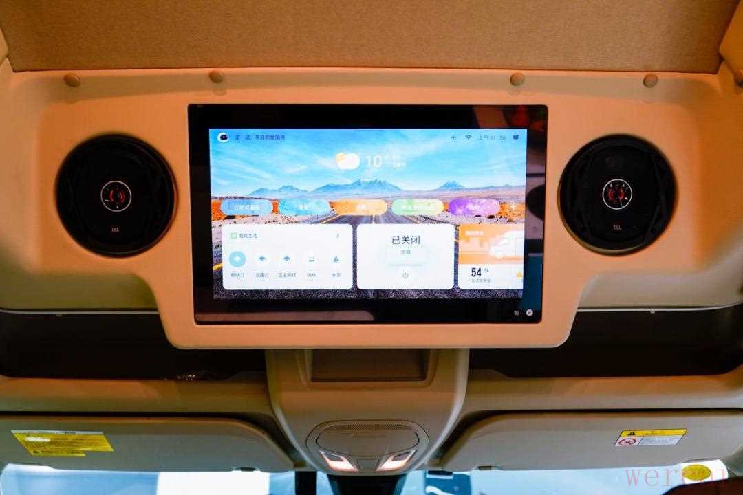 驾驶室头顶上方的大屏+语音+APP三位一体操控,就是上汽大通专为房车生活设计的全方位智能互联系统——房车管家,全场景智能化交互,房与车一体化联动,生活舱设备控制、智能场景一键模式、手机遥控器、第三方应用、手机互联,有它在能够使你的旅居生活更为便利,不仅能够通过“你好,小迈,打开/关闭... ...”语音操控完成生活区域设备操控指令,还能够通过【上汽大通MAXUS】APP远程控制,无比便捷。有这样的“管家”一同出行,房车出游怎么能不舒适呢~