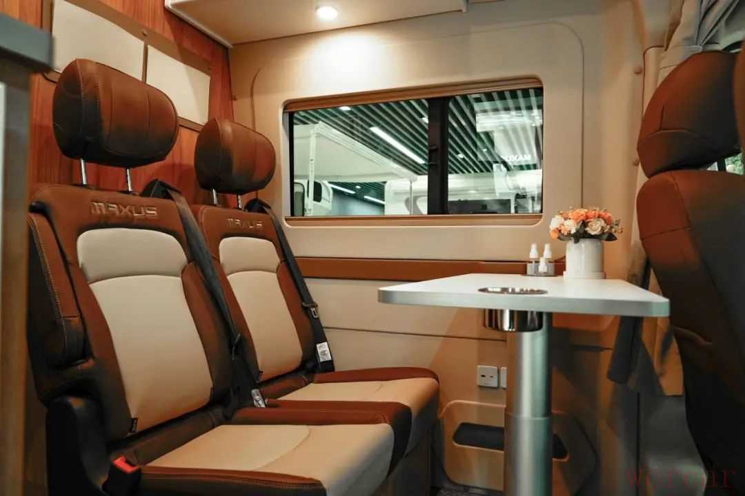 会客区由可以旋转的主副座椅和双人座椅组成,将车内空间利用的十分巧妙,驻车时会客区域更为宽敞。座椅带有三点式安全带和扶手,行车时更具安全性;座椅前方配备有一张带有杯托的电动升降餐桌,行车时也能够使桌面上的杯具的安全得到保障。