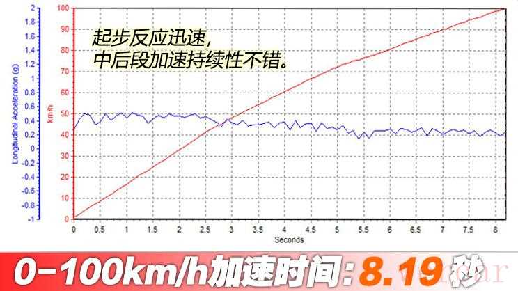加速表现,新车带有Launch Control起步控制功能,但是起步阶段打滑较为明显,轮胎恢复抓地之后一路亢奋,最终获得了8.19秒的成绩,与官方给出的7.3秒成绩相差较大。此外,测试车是一台还未超过1000km的新车,相信保养过后还会有一定提升。