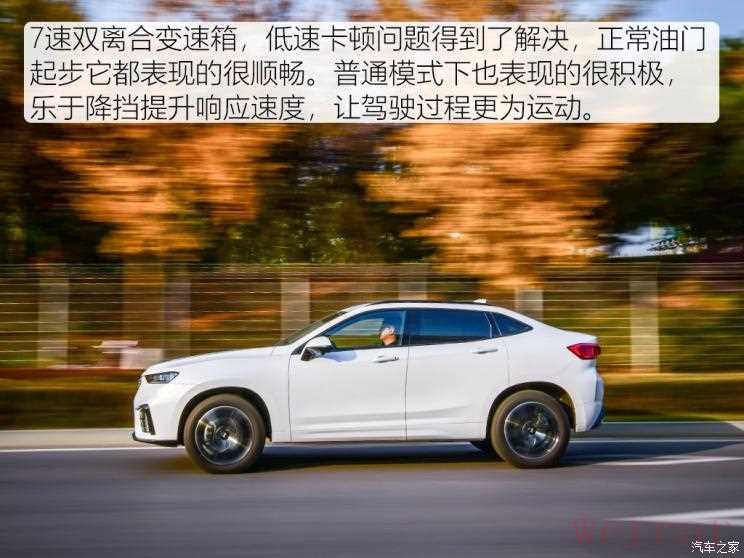 7速双离合变速箱,整体表现基本令人满意。日常驾驶,低速卡顿问题很轻微,正常油门起步它都表现的很顺畅。普通模式下变速箱的表现也比较积极,属于乐于降挡的那一类,如果你稍微加重油门它就会给你完成降挡动作,在每一个速度区间它都给你最为凌厉的加速感受。手动模式或者通过换挡拨片操作,能够发现在降挡反应这方面还有待提升,基本上会跟你的操作形成两个节奏,这种感觉在VV7车型上比较普遍,如果能够进行调整,它对驾驶感受的提升将会是质的飞越。