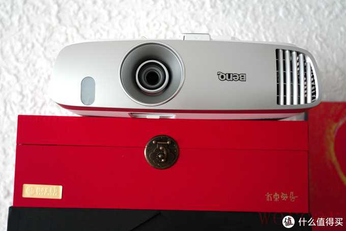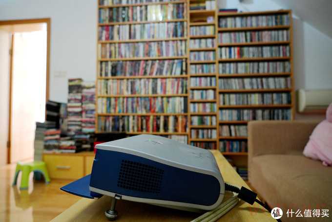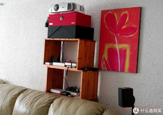 尤其是两边,不论怎么折腾都用肉眼看得见的弧度弯曲,这100多块的东西真的不能要求太高啊.......因为投影机是打算今后还是要放到楼上去的(阁楼的观影环境更好一点,比如说隔音),所以我没有选择投影机支架,简单的用原来的书架顶置暂时放一下,因为高度不够,就只能用盒子加上其他东西垫(结果发现本站送的长安东市新年贺岁礼盒高度正好 )。