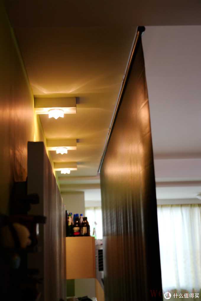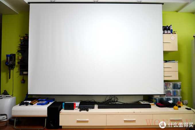 谁知,投完了以后发现,这100寸看着好像也不大嘛!于是就想,要么上一块幕布试试看?太贵的当然就是放弃感觉没必要,电动幕嘛也装不了,原来上头有射灯打下来影响光线,最终找了个本站经常推的咖观: