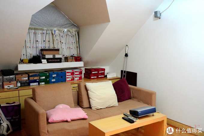 事情的演变过程大概是这样的:投影机买回来以后,本来是打算就在客厅放一下看看,然后就搬到楼上去替换Z1,原来的客厅背景就是一面大小刚好是100寸的白墙(请看下图幕布后方的那块“特制”的石膏板状墙 ):
